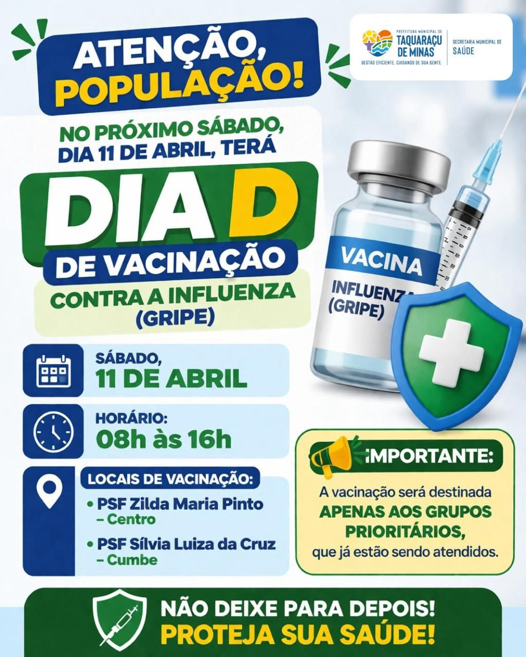 Neste sábado, dia 11 de abril, tem Dia D de Vacinação contra a Influenza (Gripe)! Data: Sábado, 11 de abril Horário: 08h às 16h Locais: PSF Zilda Maria Pinto – Centro PSF Sílvia Luiza da Cruz – Cumbe Importante: A vacinação será destinada apenas aos grupos prioritários. Não deixe para depois! Vacinar é cuidar de você e de quem você ama.