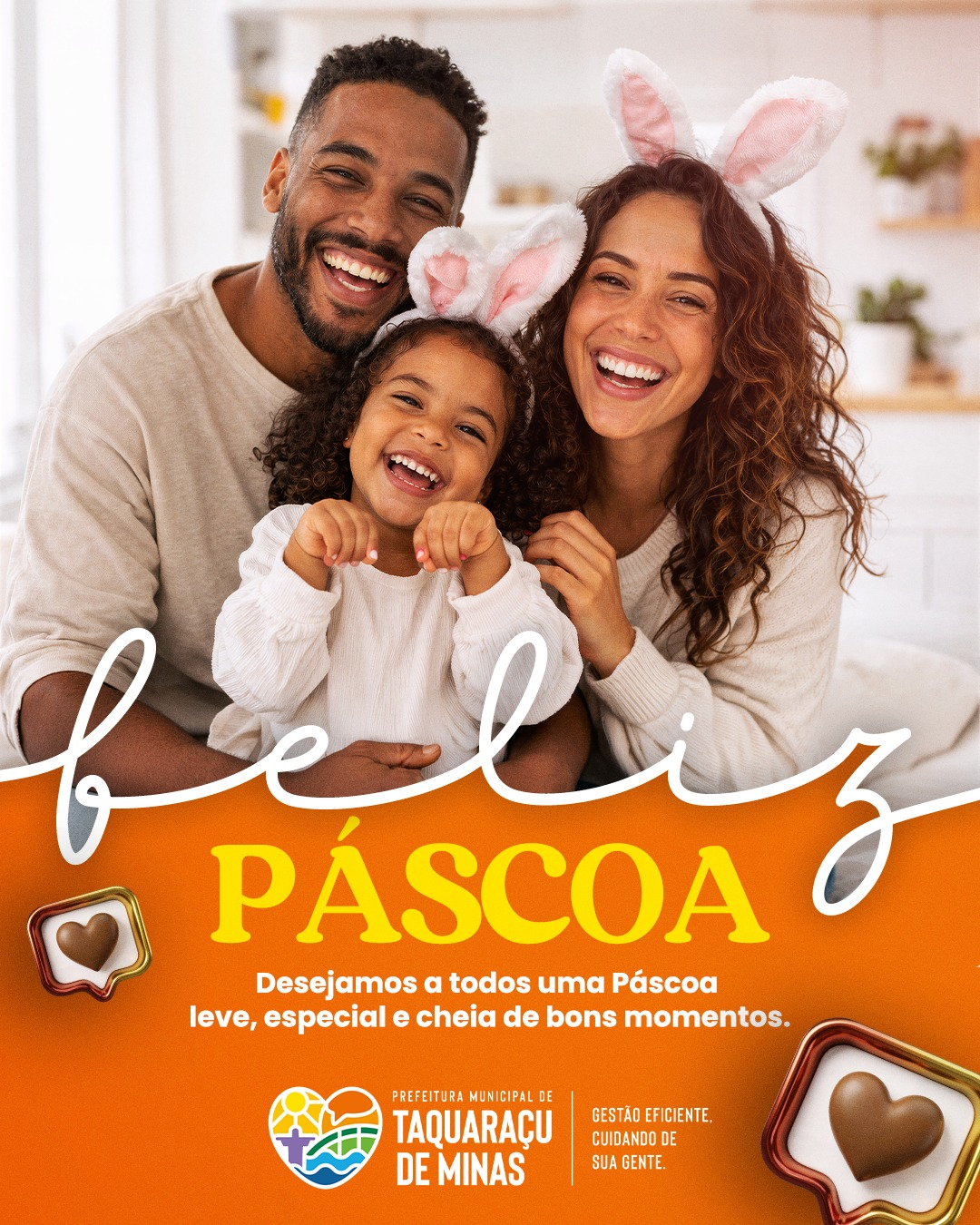 FELIZ PÁSCOA A Prefeitura Municipal de Taquaraçu de Minas deseja a todos uma Páscoa repleta de paz, amor e momentos especiais ao lado de quem você ama! Que esta data renove as esperanças e traga muita alegria para todas as famílias. Gestão eficiente, cuidando de sua gente.